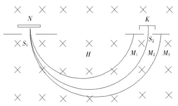圖1表示氦質(zhì)譜檢漏儀的原理圖,在質(zhì)譜室的離子源N內(nèi),氣體被電離成離子。在電場作用下離子聚焦成束,并以一定的速度經(jīng)由縫隙S1進入磁分析器,在均勻磁場的作用下,具有一定速度的離子束,將按圓形軌跡運動。調(diào)節(jié)加速電壓U使氦離子束M2恰能通過縫隙S2到達收集極K而形成離子流。利用弱電流量測設(shè)備,使之在輸出儀表與音響裝置上反映出來。而其他不同于M2的離子束(如圖中M1,M3)則以不同的偏轉(zhuǎn)半徑而被分開。